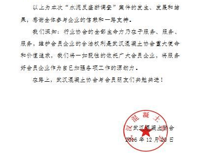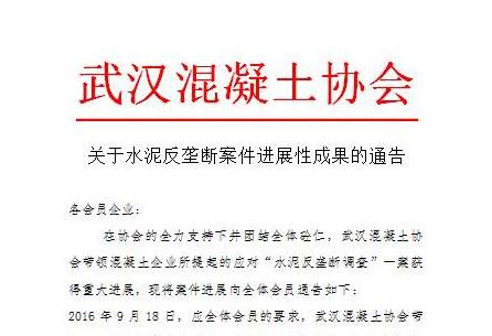事情的原由是今年9月份,由于武漢當(dāng)?shù)厮鄡r格統(tǒng)一漲價,武漢混凝土協(xié)會帶領(lǐng)140余家混凝土企業(yè)在《反壟斷調(diào)查申請書》上簽章。9月19日,湖北省物價局反壟斷分局依照法定程序受理申請人的申請后,啟動專案組,9月20日趕赴各地涉案水泥企業(yè)開展調(diào)整取證工作。隨后,涉及壟斷漲價的水泥企業(yè)相繼坦陳了自己的問題,也向執(zhí)法部門表達(dá)愿與混凝土企業(yè)和諧共生的真實(shí)愿望。2016年10月20日,各水泥企業(yè)主要負(fù)責(zé)人約請主要混凝土企業(yè)負(fù)責(zé)人、邀請湖北省水泥協(xié)會和武漢混凝土協(xié)會的主要負(fù)責(zé)人展開了務(wù)實(shí)而友好的交談,雙方達(dá)成多項建設(shè)性共識。