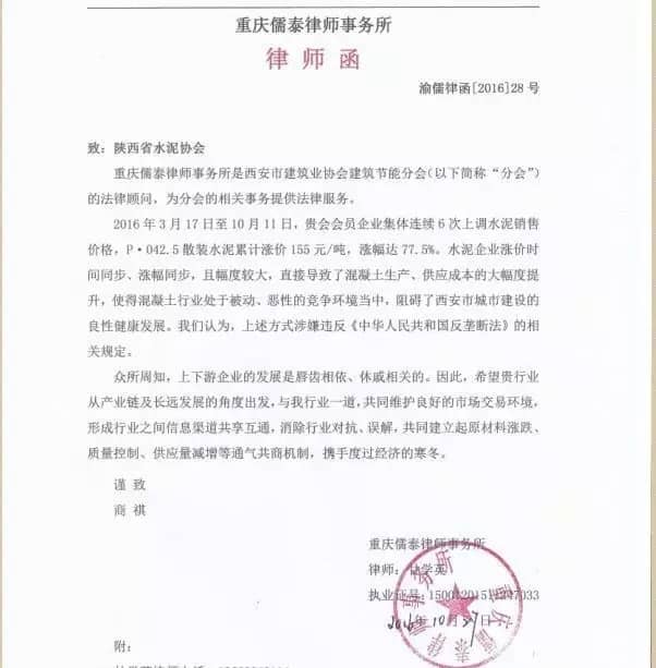 無獨(dú)有偶,今年10月份,西安水泥價格暴漲,引起了西安地區(qū)混凝土生產(chǎn),供應(yīng)成本的大幅提升,使得當(dāng)?shù)鼗炷列袠I(yè)處于被動地位,西安市建筑業(yè)協(xié)會建筑節(jié)能分會認(rèn)為這一市場情況違反了《中華人民共和國反壟斷法》的相關(guān)規(guī)定,向陜西省水泥協(xié)會發(fā)律師函。