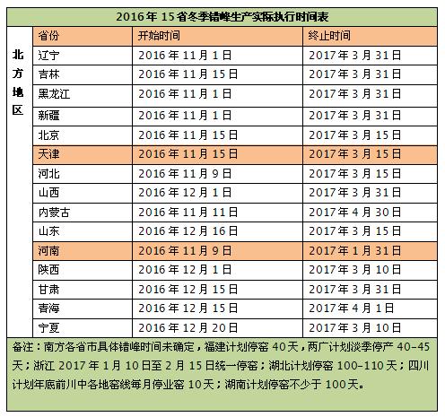 2016年冬季錯(cuò)峰生產(chǎn)實(shí)際執(zhí)行時(shí)間表,供參考,如下: