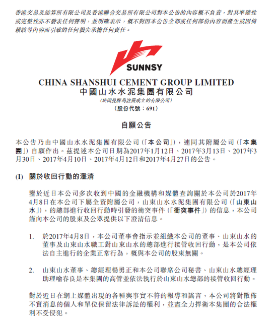 26日午間,山水水泥于港交所發(fā)布公告稱,2017年4月8日,董事會指示并組織本公司的董事、山東山水的董事及山東山水職工對山東山水的總部進(jìn)行接管收回行動,是本公司依法自主進(jìn)行的企業(yè)正常行為,概與本公司的股東無關(guān)。
