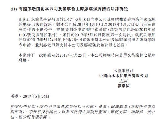 公告指出,山東山水董事、總經(jīng)理楊勇正和本公司聯(lián)席公司秘書、山東山水總經(jīng)理助理喻春良是本集團(tuán)的高管并依法執(zhí)行于山東山水總部的接管收回行動。宓敬田對本公司及董事會主席廖耀強提請的法律訴訟,本案件下一次聆訊定于2017年7月25日。