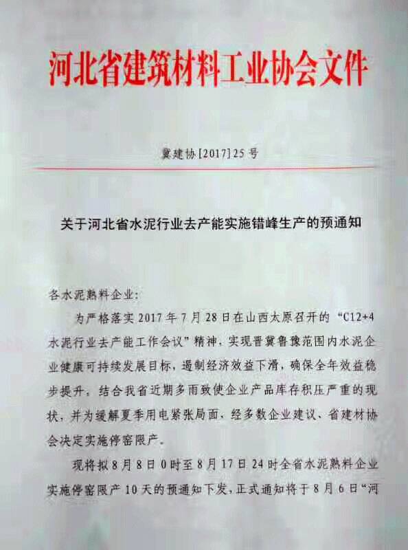 近日,河北省建筑業(yè)協(xié)會(huì)下發(fā)冀建協(xié)【2017】25號(hào)《關(guān)于河北省水泥行業(yè)去產(chǎn)能實(shí)施錯(cuò)鋒生產(chǎn)的預(yù)通知》文件,要求河北省內(nèi)水泥熟料企業(yè)于8月8月0時(shí)至8月17日24時(shí)實(shí)施停窯限產(chǎn)10天。