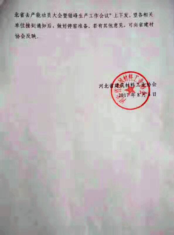 通知稱(chēng):為嚴(yán)格落實(shí)2017年7月28日在山西太原召開(kāi)的“C12+4水泥行業(yè)去產(chǎn)能工作會(huì)議”精神,實(shí)現(xiàn)晉冀魯豫水泥企業(yè)健康可持續(xù)發(fā)展目標(biāo),遏制經(jīng)濟(jì)效益下滑,確保全年效益穩(wěn)步提升,結(jié)合河北省近期多雨致使企業(yè)產(chǎn)品庫(kù)存積壓嚴(yán)重的現(xiàn)狀,并為緩解夏季用電緊張局面,經(jīng)多數(shù)企業(yè)建議、河北省建材協(xié)會(huì)決定實(shí)施停窯限產(chǎn)措施。