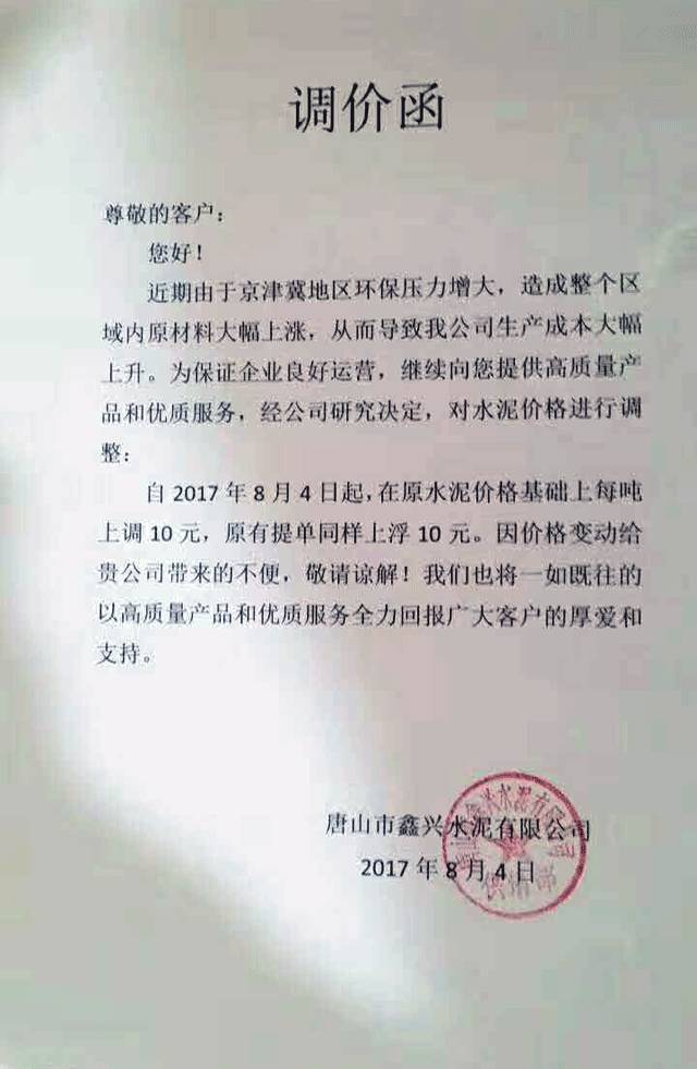 企業(yè)調(diào)價(jià)通知稱(chēng):由于近期京津冀地區(qū)環(huán)保壓力增大,造成整個(gè)區(qū)域內(nèi)原材料大幅上漲,從而導(dǎo)至企業(yè)生產(chǎn)成本大幅上升。為保證企業(yè)良好運(yùn)營(yíng),繼續(xù)向下游客戶(hù)提供高質(zhì)量產(chǎn)品和優(yōu)質(zhì)服務(wù),經(jīng)研究決定,對(duì)水泥價(jià)格進(jìn)行上調(diào)。上調(diào)幅度在10元~30元不等,