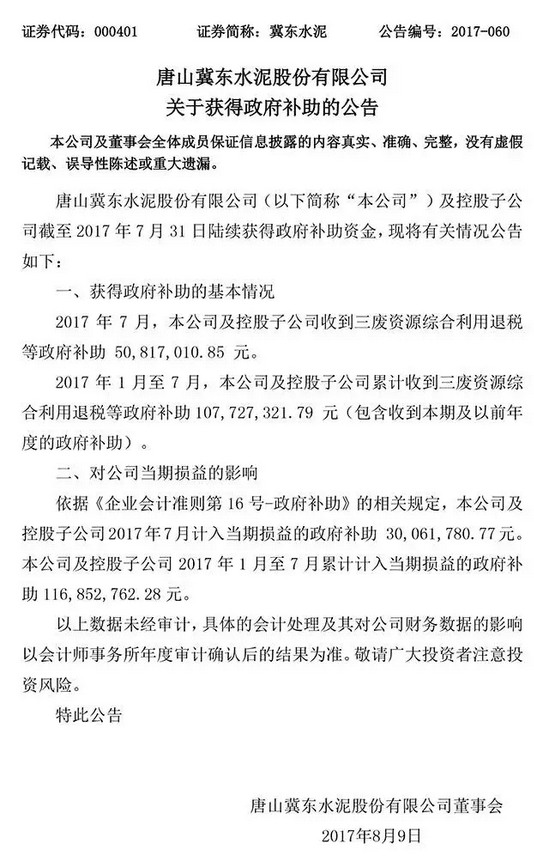 冀東水泥(000401)8月9日晚間公告,7月份公司及控股子公司收到三廢資源綜合利用退稅等政府補助約5082萬元,今年1月至7月,公司及控股子公司累計收到三廢資源綜合利用退稅等政府補助約1.08億元(包含收到本期及以前年度的政府補助)。公司及控股子公司2017年7月計入當期損益的政府補助約3006萬元,前7個月累計計入當期損益的政府補助約1.17億元。