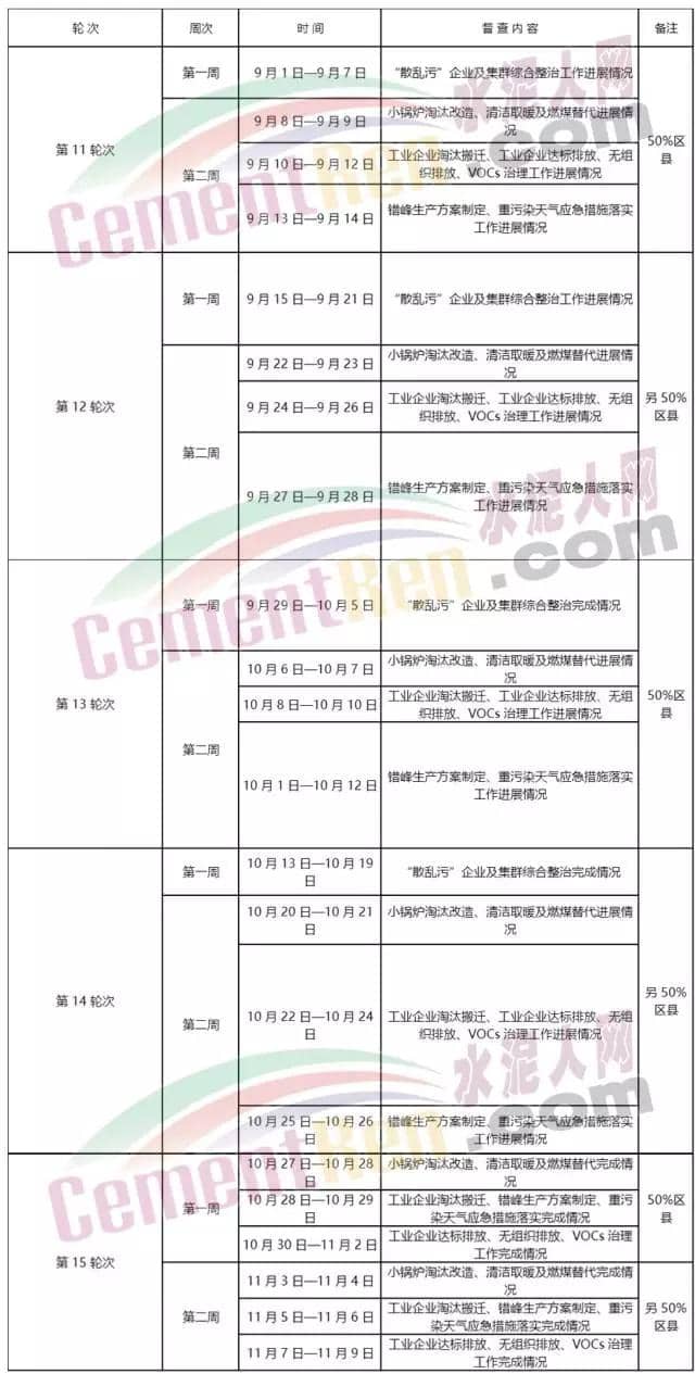 第一階段(2017 年 9 月 1 日至 11 月 9 日),共 5 個輪次(第 11至 15 輪次)70 天,重點對“2+26”城市所有縣(區(qū))全部 12 項任務(wù)完成情況、各項減排措施的落實情況、任務(wù)清單外的涉氣類突出問題以及《攻堅方案》中“2+26”城市的其他大氣污染綜合治理任務(wù)進(jìn)行督查(具體安排見附 2)。