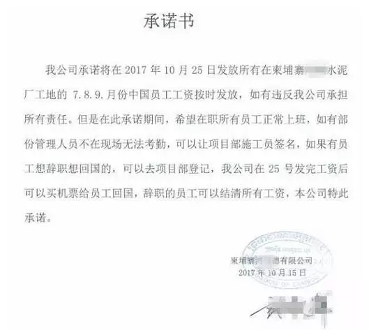 承諾書(shū)稱(chēng),將在10月25日發(fā)放所有在工地的中國(guó)員工7、8、9月份的工資,并希望在此之前工人們都能正常上班。