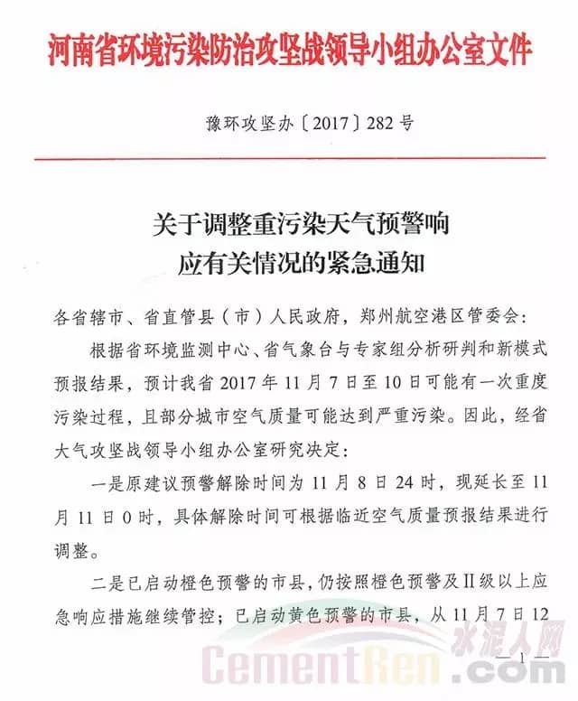 本次通知文件明確“原建議預(yù)警解除時間為11月8日24時,現(xiàn)延長至11月11日0時,具體解除時間可根據(jù)臨近空氣質(zhì)量預(yù)報結(jié)果進(jìn)行調(diào)整。”,考慮到費用支出,節(jié)能降耗減排問題。省內(nèi)部分熟料生產(chǎn)線企業(yè)表示將會把此次重污染天氣管控停產(chǎn)與2017-2018年采暖季錯峰生產(chǎn)一并執(zhí)行,復(fù)產(chǎn)日期延期至2018年3月15日。