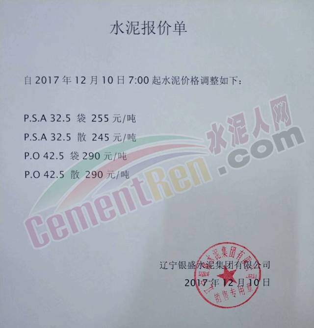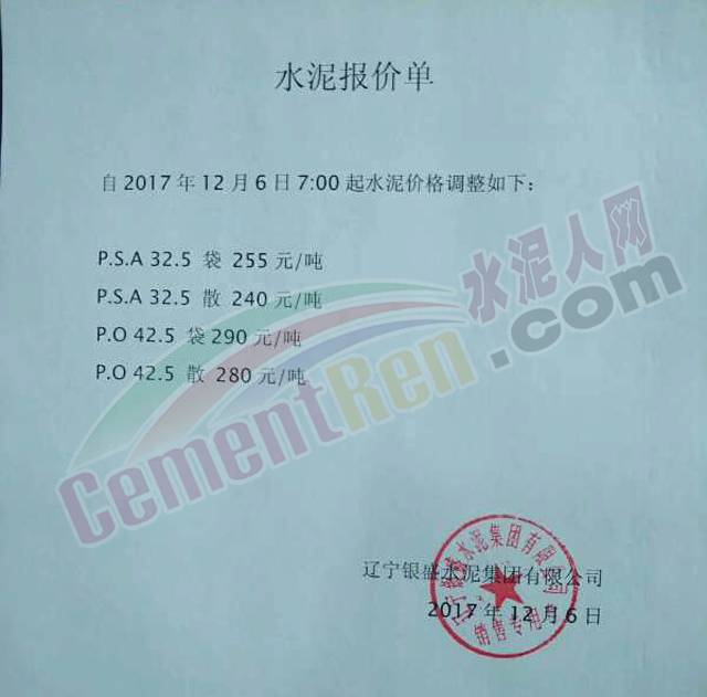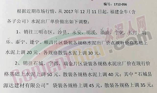 12月11日通知稱,根據(jù)市場行情,從11日起福建金牛(含子公司)水泥出廠單價:銷往三明市區(qū)、沙縣、永安、明溪、清流、寧化、長汀、將樂、泰寧、建寧、順昌片區(qū)袋裝各規(guī)格水泥出廠價在現(xiàn)行價格基礎(chǔ)上上調(diào)20元/噸,各規(guī)格散裝水泥上調(diào)30元/噸。銷往石城、寧都、瑞金片區(qū)袋裝各規(guī)格水泥出廠價在現(xiàn)行價格基礎(chǔ)上上調(diào)50元/噸、散裝各規(guī)格水泥上調(diào)40元/噸。其中石城縣源達(dá)建材有限公司袋裝各規(guī)格上調(diào)45元/噸,散裝各規(guī)格上調(diào)35元/噸。