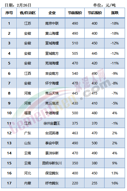 2 河北保定冀東水泥:河北保定地區(qū)(含雄安新區(qū))PO42.5散裝水泥到位價執(zhí)行450元/噸,較節(jié)前上調(diào)50元/噸。