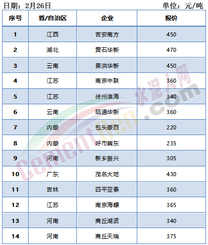 部分企業(yè)PC32.5袋裝水泥出廠報價