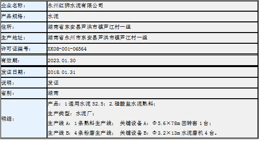 日前,水泥人網(wǎng)從國(guó)家質(zhì)檢總局獲悉,永州紅獅水泥已于今年1月底取得生產(chǎn)許可證。