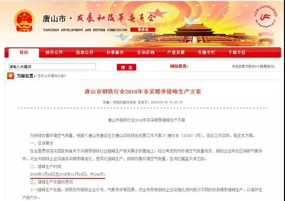 據(jù)水泥人網(wǎng)了解,唐山市發(fā)改委日前發(fā)布了《唐山市鋼鐵行業(yè)2018年非采暖季錯峰生產(chǎn)方案》唐山市鋼鐵企業(yè)錯峰生產(chǎn)時間為2018年3月16日至2018年11月14日共244天。同時,未取得排污許可證的鋼鐵企業(yè)全部停產(chǎn),位于市主城區(qū)的鋼鐵企業(yè)基礎(chǔ)限產(chǎn)比例為15%,主城區(qū)之外的鋼鐵企業(yè)基礎(chǔ)限產(chǎn)比例為10%。