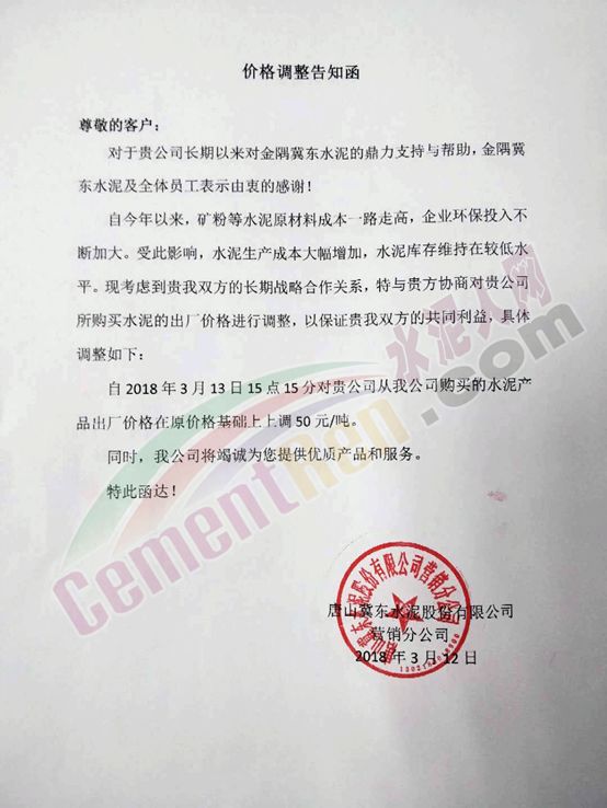 唐山冀東水泥價格調(diào)整通知