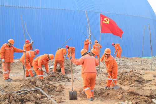 植樹地點(diǎn)位于公司三線石灰石堆場(chǎng)北側(cè)的山坡上,活動(dòng)現(xiàn)場(chǎng),黨員團(tuán)員充分發(fā)揮模范帶頭作用,大家在領(lǐng)取了樹苗和工具后,緊張有序的開始勞動(dòng),植樹現(xiàn)場(chǎng),立刻呈現(xiàn)出一派繁忙的勞動(dòng)景象。參加植樹的職工個(gè)個(gè)熱情洋溢、干勁十足,有的拿鐵鍬,有的扶樹苗,你追我趕,比干勁、比進(jìn)度,各個(gè)環(huán)節(jié)銜接有序,樣樣做得認(rèn)真到位,個(gè)個(gè)忙得滿頭大汗。到處都是忙碌的身影和勞動(dòng)的歡聲笑語(yǔ)……大家干勁十足地完成了從挖坑、放樹、填土、踩實(shí)到最后澆水的每一個(gè)步驟。熱火朝天的場(chǎng)景,與不遠(yuǎn)處鮮紅的黨旗團(tuán)旗遙相呼應(yīng)、熠熠生輝。經(jīng)過(guò)大家辛勤地勞動(dòng),一棵棵樹苗扎根于沃土,煥發(fā)出勃勃生機(jī)。