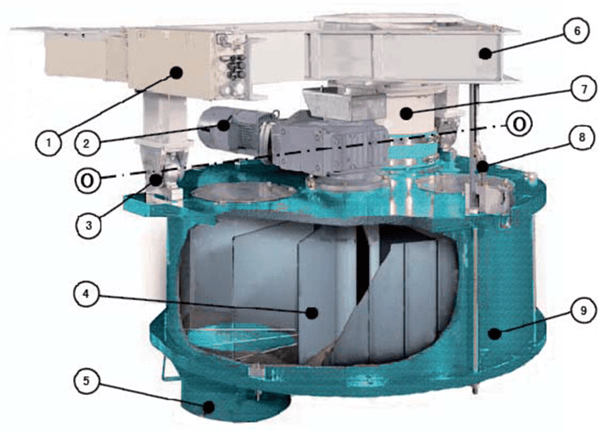1 框架 2 驅(qū)動(dòng)裝置 3 懸掛裝置 4 輪輻轉(zhuǎn)子 5 出料口
