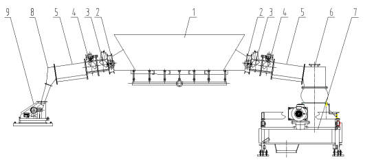 5、布風(fēng)斜槽 6、轉(zhuǎn)接溜子 7、輪輻轉(zhuǎn)子計(jì)量裝置 8、下料溜子 9、固體流量計(jì)