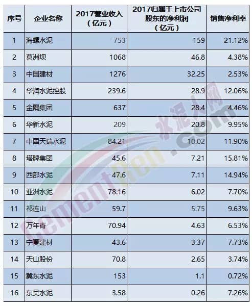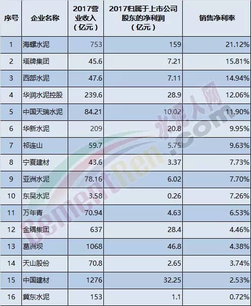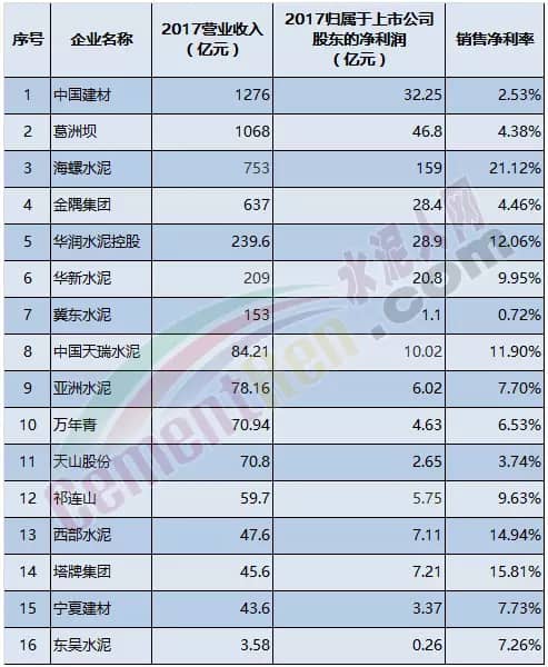 以上16家企業(yè)按上年營業(yè)收入排名計算,中國建材2017年營業(yè)收入1276億元排名第一,按銷售凈利率計算中國建材卻排在第15位。海螺水泥2017年營業(yè)收入753億元,在以上16家企業(yè)中排名第三位。