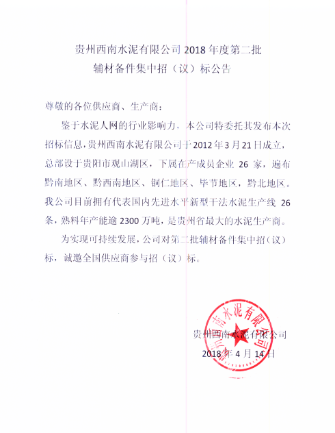 貴州西南水泥有限公司2018年度第二批輔材備件集中招(議)標(biāo)公告