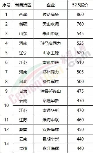 以上數(shù)據(jù)顯示,世界屋脊西藏拉薩的最高價(jià)水泥,52.5強(qiáng)度重點(diǎn)項(xiàng)目政府指導(dǎo)價(jià)在800元/噸,非重點(diǎn)項(xiàng)目出廠價(jià)格最高在860元/噸。那么,除西藏地區(qū)外,還有哪些區(qū)域水泥價(jià)格能夠與西藏地區(qū)比肩的呢?水泥人網(wǎng)特將各區(qū)域的“頂尖”價(jià)格綜合列表如下: