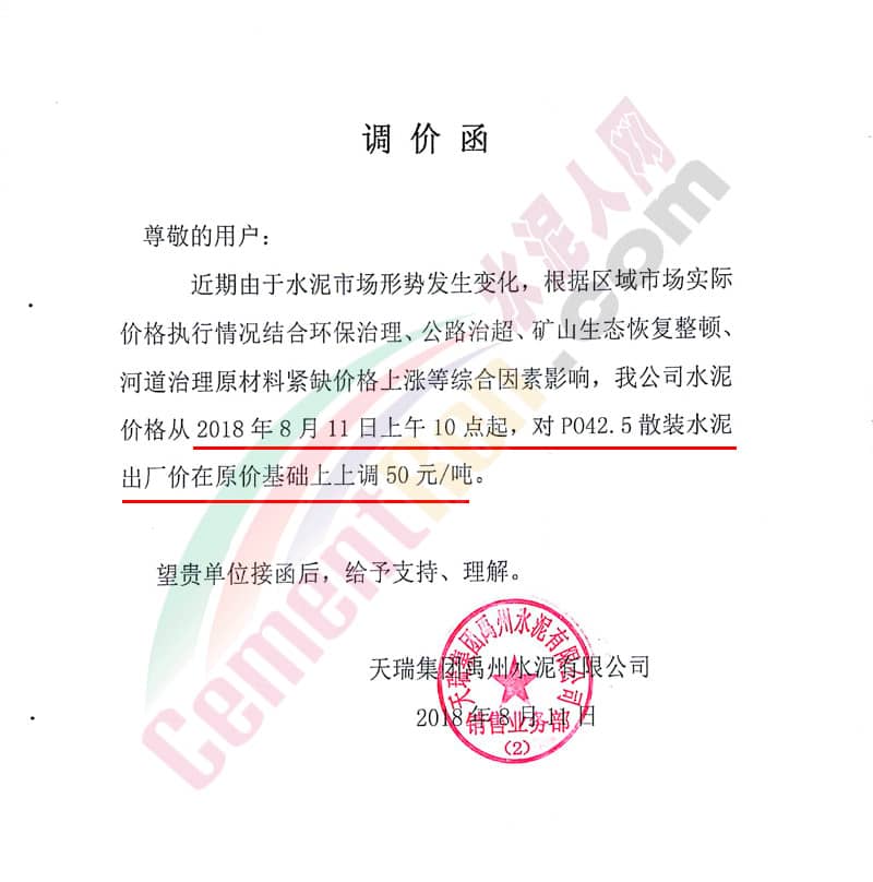 天瑞集團(tuán)許昌水泥有限公司價(jià)格調(diào)整告知函稱,根據(jù)目前環(huán)保力度增大,為了做好去產(chǎn)能和節(jié)能減排工作,有效消化錯(cuò)峰生產(chǎn)、原材料漲價(jià)帶來的成本增加,本著長(zhǎng)期誠(chéng)信服務(wù)、深度合作、互惠共贏的經(jīng)營(yíng)理念,為了公司的可持續(xù)發(fā)展,自2018年8月11日上午10點(diǎn)起對(duì)PC32.5R級(jí)水泥統(tǒng)一上調(diào)20元/噸,PO42.5級(jí)水泥統(tǒng)一上調(diào)50元/噸。