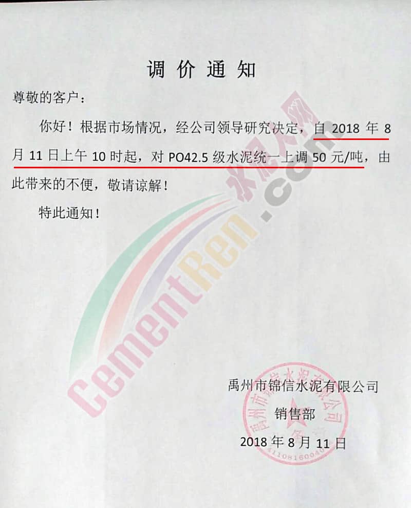 禹州市錦信水泥有限公司銷售部調(diào)價(jià)通知稱,根據(jù)市場(chǎng)情況,公司領(lǐng)導(dǎo)研究決定自8月11日上午10時(shí)起對(duì)PO42.5級(jí)水泥統(tǒng)一上調(diào)50元/噸。