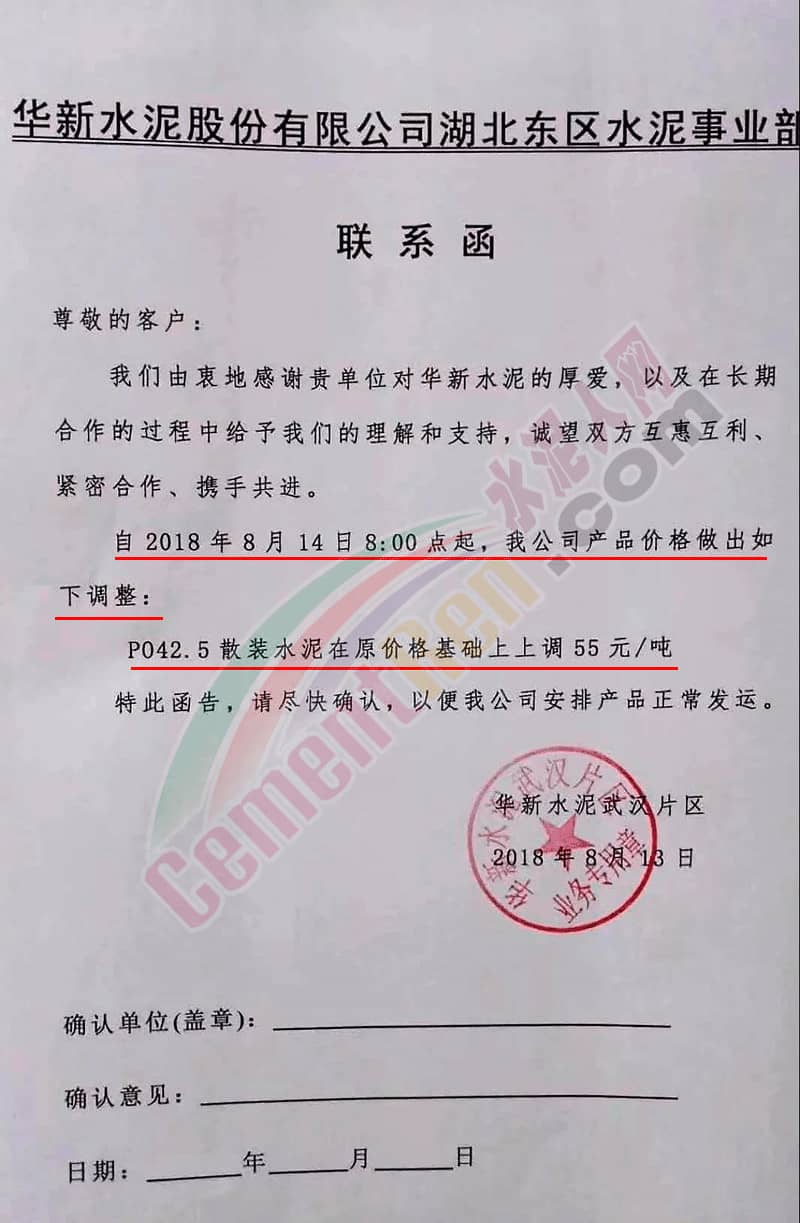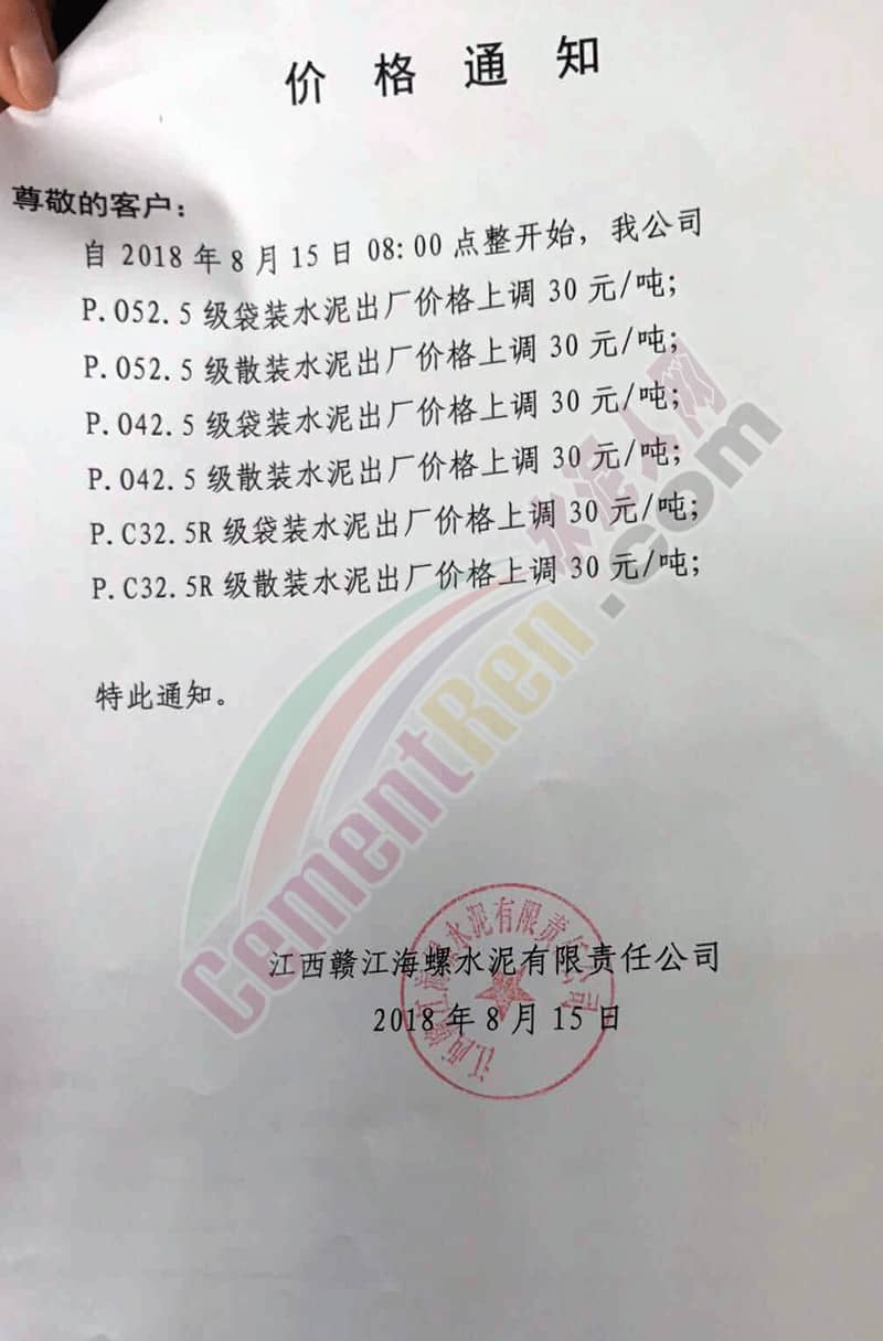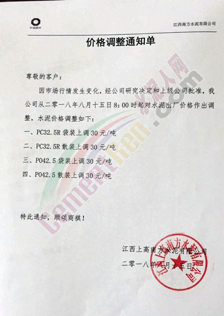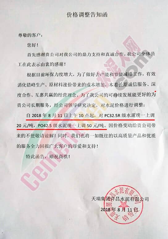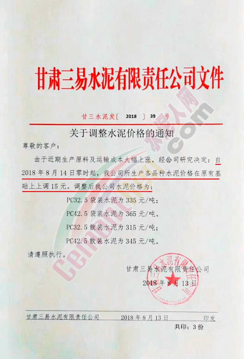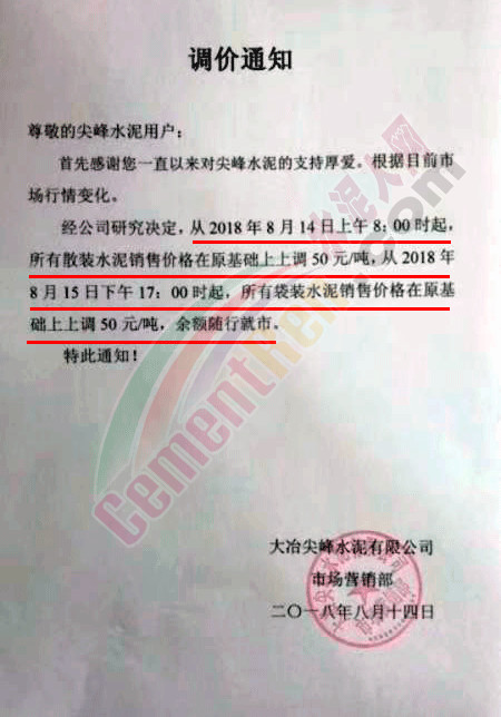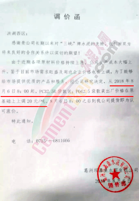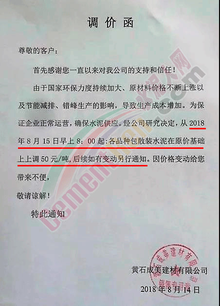 附部分水泥企業(yè)漲價(jià)通知: