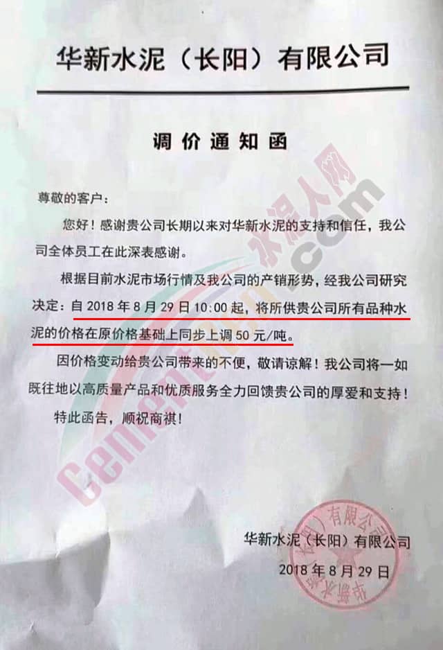 水泥人網(wǎng)8月29日湖北華新水泥(長陽)、華新水泥(秭歸)、葛洲壩松滋、葛洲壩當(dāng)陽等水泥企業(yè)發(fā)布漲價通知稱上調(diào)水泥價格,上調(diào)幅度50元/噸。調(diào)價通知如下: