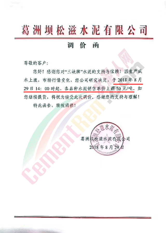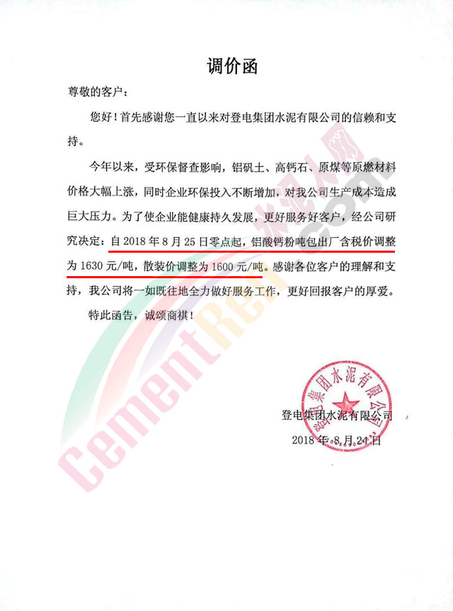 25日發(fā)調(diào)價函通知客戶自8月26日零點起,“世利牌“硫鋁酸鹽系列產(chǎn)品出廠單價在原價格基礎(chǔ)上上調(diào)50元/噸。