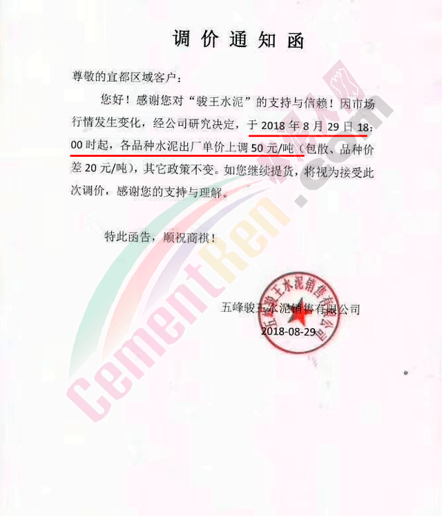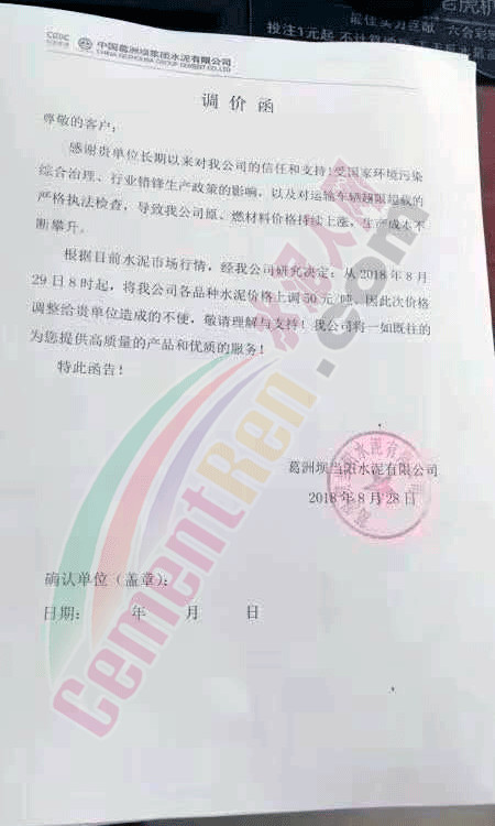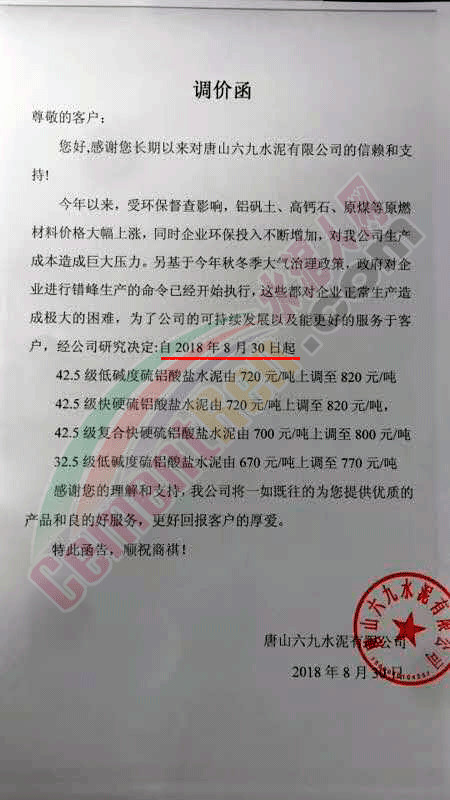 昨日,唐山六九水泥發(fā)布調(diào)價函稱,今年以來,受環(huán)保督查影響原材料及煤炭原燃材料價格大幅上漲,同時企業(yè)環(huán)保投入不斷增加。對公司生產(chǎn)成本造成巨大壓力。另基于今年秋冬大氣治理政策,政府對企業(yè)進行錯峰生產(chǎn)的命令已經(jīng)開始執(zhí)行,這些都對企業(yè)正常生產(chǎn)造成極大的困難,為了公司的可持續(xù)發(fā)展,經(jīng)公司研究決定自8月30日起上調(diào)42.5級水泥價格,各類型產(chǎn)品價格上調(diào)100元/噸。調(diào)價函原文如下: