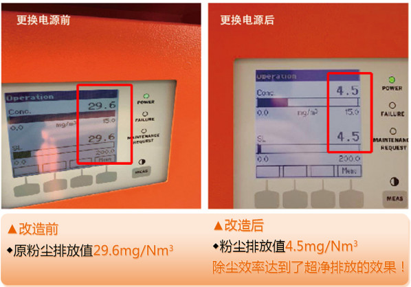 煤山南方水泥本次技改中,除塵器本體檢修和改造,是利用停窯檢修期間完成的。為驗(yàn)證智能變頻脈沖電源的除塵效率,除塵電源是在生產(chǎn)期間進(jìn)行不停窯更換的,更換前在線監(jiān)測(cè)顯示粉塵排放為29.6 mg/Nm3,更換完成后,監(jiān)測(cè)儀顯示粉塵排放很快降低至4.5 mg/Nm3左右,除塵效果顯著且直觀真實(shí)!