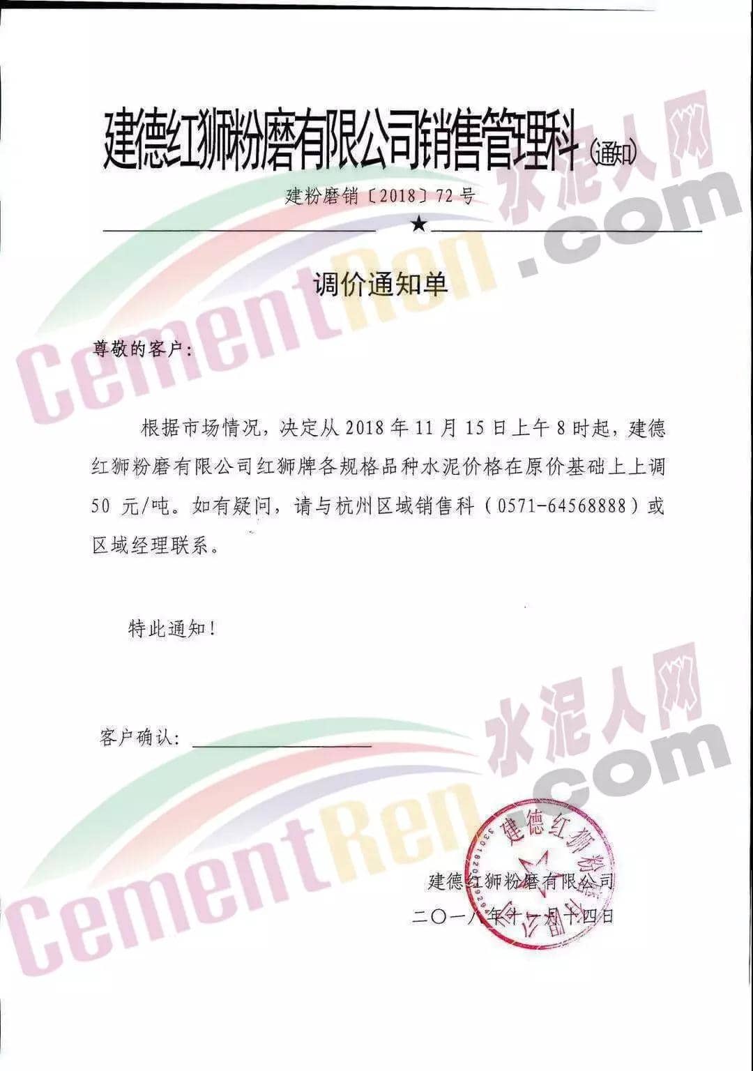 建德紅獅粉磨有限公司銷售管理科發(fā)布調(diào)價(jià)通知稱:決定從2018年11月15日上午8時(shí)起,建德紅獅粉磨有限公司紅獅牌各種規(guī)格品種水泥價(jià)格在原價(jià)基礎(chǔ)上上調(diào)50元/噸。