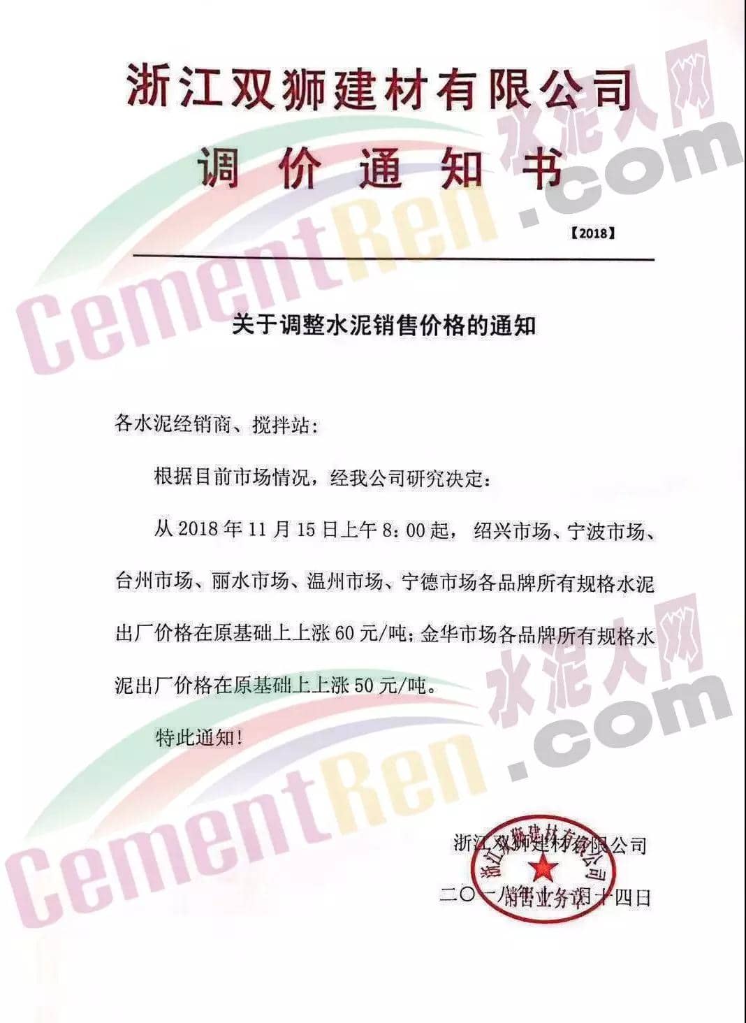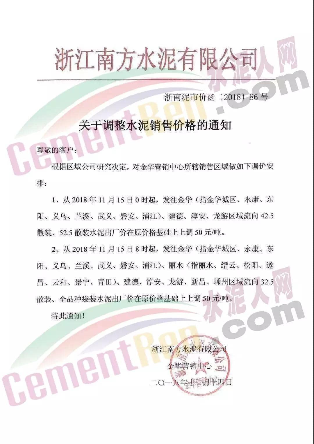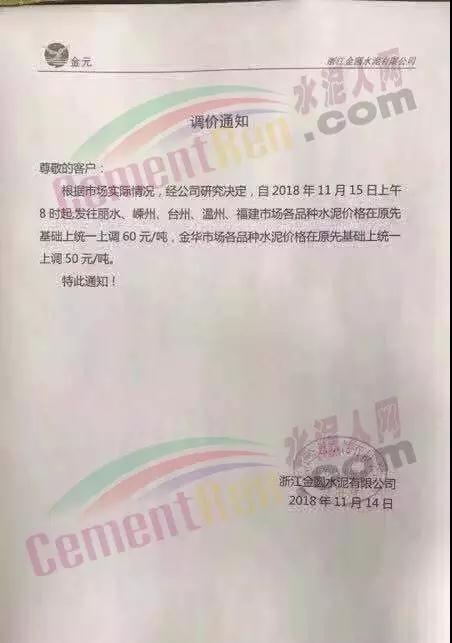 自2018年11月15日8時(shí)起,發(fā)往金華、麗水、建德、淳安、龍游、新昌、嵊州區(qū)域流向的32.5散裝、全品種袋裝水泥出廠價(jià)格在原價(jià)格基礎(chǔ)上上調(diào)50元/噸。