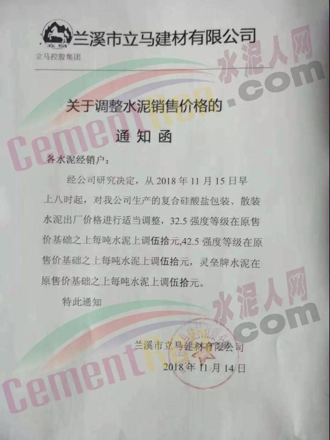 蘭溪市立馬建材有限公司發(fā)布通知稱,從2018年11月15日早上8:00時(shí)起,對(duì)公司生產(chǎn)的復(fù)合硅酸鹽包裝、散裝水泥出廠價(jià)格進(jìn)行適當(dāng)調(diào)整,32.5強(qiáng)度等級(jí)在原售價(jià)基礎(chǔ)上每噸水泥上調(diào)50元,42.5在原售價(jià)基礎(chǔ)上每噸水泥上調(diào)50元,靈壘牌水泥在原售價(jià)基礎(chǔ)上上調(diào)50元/噸。