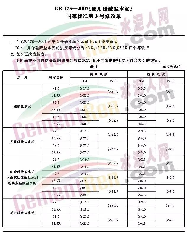 據(jù)水泥人網(wǎng)消息,昨日(11月19日)國(guó)家市場(chǎng)監(jiān)督管理總局標(biāo)準(zhǔn)委發(fā)布了2018年第15號(hào)公告,國(guó)家市場(chǎng)監(jiān)督管理總局、國(guó)家標(biāo)準(zhǔn)化管理委員會(huì)批準(zhǔn)了《汽車用制動(dòng)器襯片》等27項(xiàng)國(guó)家標(biāo)準(zhǔn)和2項(xiàng)國(guó)家標(biāo)準(zhǔn)修改單,其中包括GB 175-2007《通用硅酸鹽水泥<第3號(hào)修改單>》,主要內(nèi)容為“全面取消32.5復(fù)合硅酸鹽水泥”,該標(biāo)準(zhǔn)于2019年10月1日起正式實(shí)施。