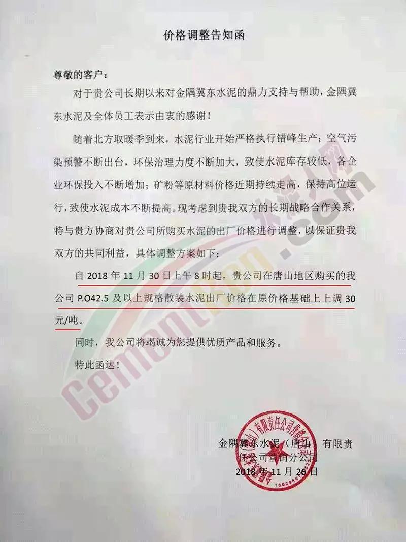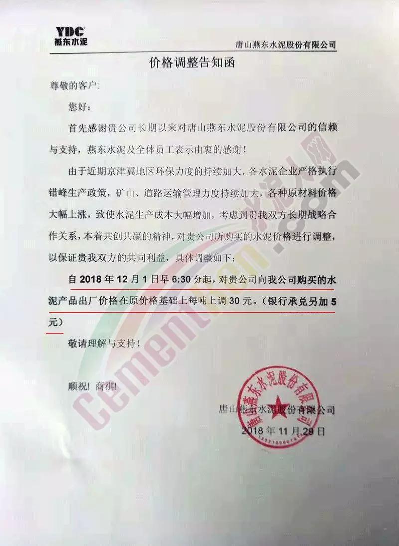 同期唐山燕東水泥,唐山泓泰水泥,六九水泥也跟隨發(fā)布了調(diào)價(jià)通知,稱(chēng)自下月初起上調(diào)了水泥出廠價(jià)格,上調(diào)幅度30元/噸。