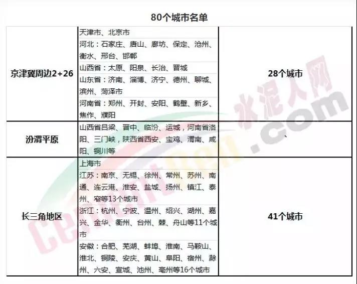 2018年錯峰停限產(chǎn)區(qū)域不再僅僅限于京津冀及周邊地區(qū),長三角一市三省、汾渭平原等區(qū)域也納入進來。涉及城市數(shù)量將從此前的2+26個城市增加至現(xiàn)在80個城市。自2018年11月1日起,河北、河南、山東、山西、遼寧、吉林、陜西、甘肅、安徽、江蘇 、天津、新疆等幾十個地區(qū)近2000家水泥企業(yè)參與錯峰停限產(chǎn)。