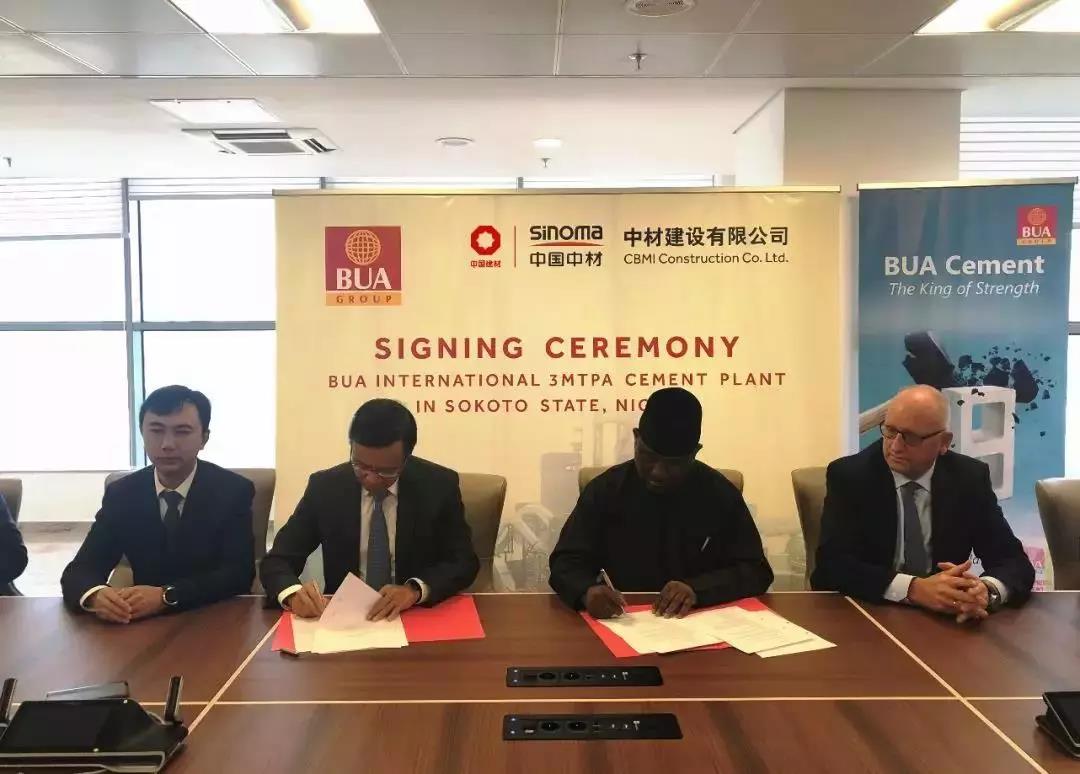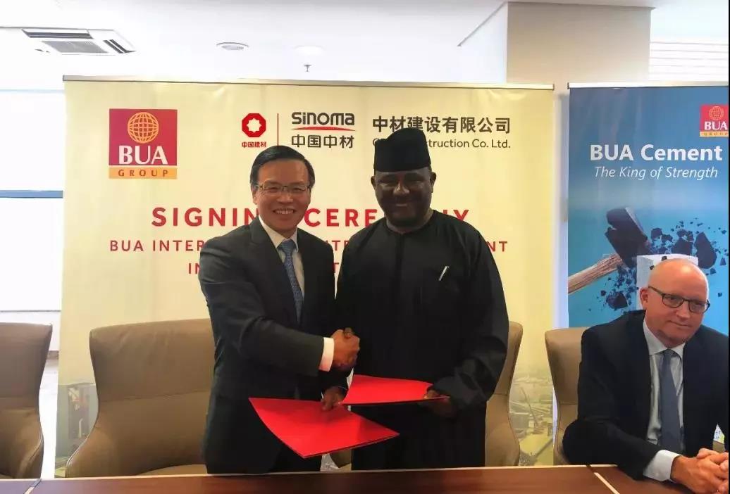 BUA集團(tuán)主席Mr.RABIU和中材建設(shè)有限公司執(zhí)行董事童來茍先生分別代表雙方在合同上簽字,BUA集團(tuán)水泥板塊首席運(yùn)營(yíng)官M(fèi)r. FINN與中材建設(shè)有限公司副總經(jīng)理李明見證了合同的簽約。
