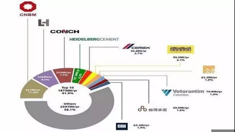 2018年《環(huán)球水泥網(wǎng)》公布的全球前十大水泥生產(chǎn)商中前10大企業(yè)占據(jù)了全球41.8%的產(chǎn)能,其中四家中國(guó)水泥企業(yè)(包含臺(tái)灣)合計(jì)產(chǎn)能10億噸,占據(jù)了前十大合計(jì)產(chǎn)能的54%。
