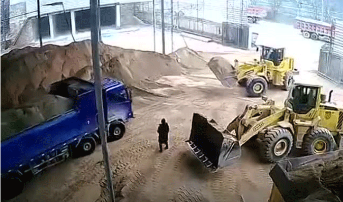 這是河北省某地的一家混凝土攪拌站的物料堆場,視頻里一位工作人員在鏟車邊上來回走動,鏟車司機(jī)可能沒注意到有人在鏟斗前面,便誤將工作人員鏟進(jìn)了料斗,隨即到料堆取料,連人帶料一起投入了喂料倉。小編注意到這名工作人員被鏟進(jìn)喂料倉后,鏟車鏟斗拍了幾下,隨后這名工作人員還掙扎著動了一下。