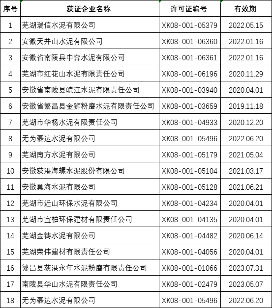 蕪湖市部分水泥生產(chǎn)企業(yè)名單