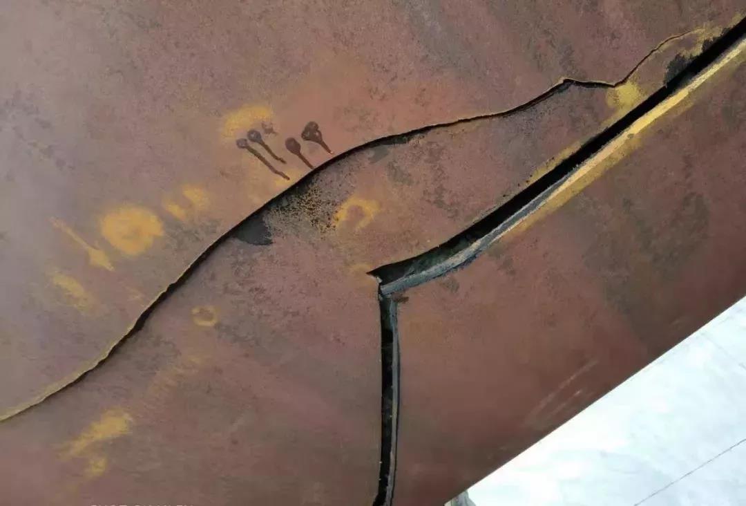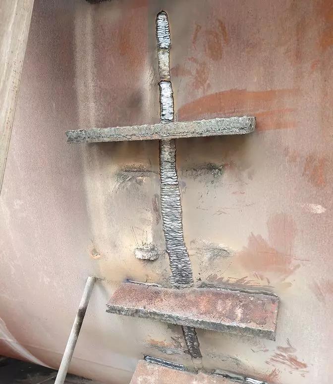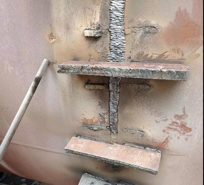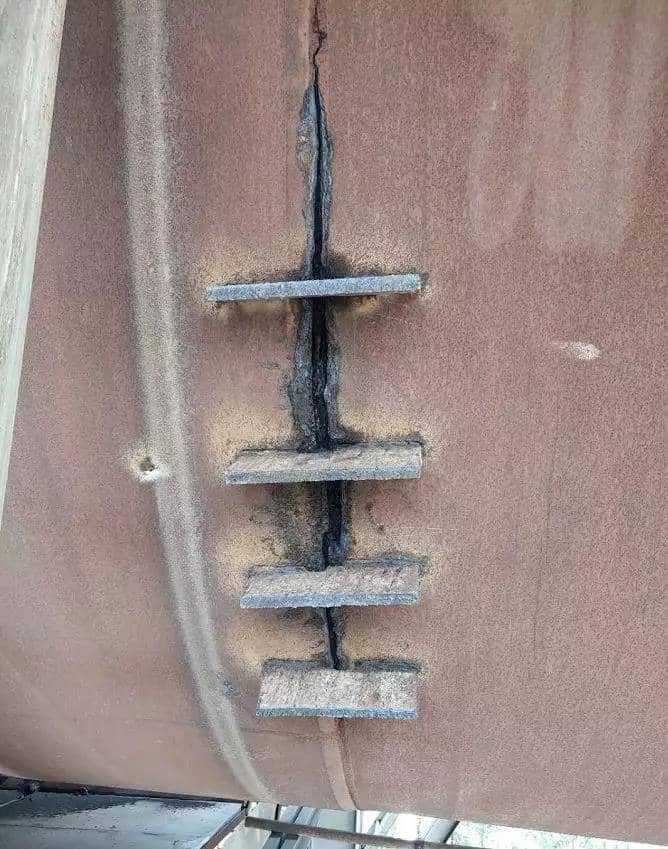 近年來,筒體開裂的情況多有發(fā)生,緊急處理通常是采用上述焊接的方法做修補(bǔ),以保證在較短的時間內(nèi)恢復(fù)窯運轉(zhuǎn)。通常施工方會給出內(nèi)外同焊的施工方案,也就是從窯筒體的內(nèi)外兩側(cè)分別焊補(bǔ)。