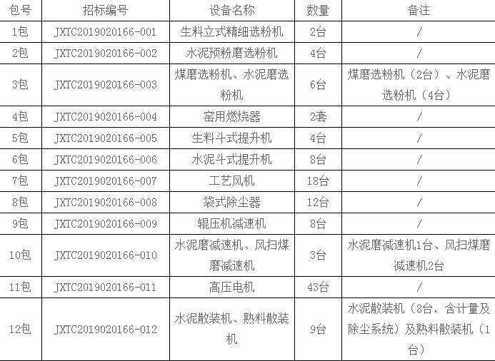 包12:近五年(2014年1月1日以來)內(nèi)投標(biāo)人在中國大陸至少有兩個生產(chǎn)能力4000噸/天及以上熟料水泥生產(chǎn)線或年產(chǎn)100萬噸及以上水泥粉磨站同類設(shè)備供貨業(yè)績(含改造項目)。