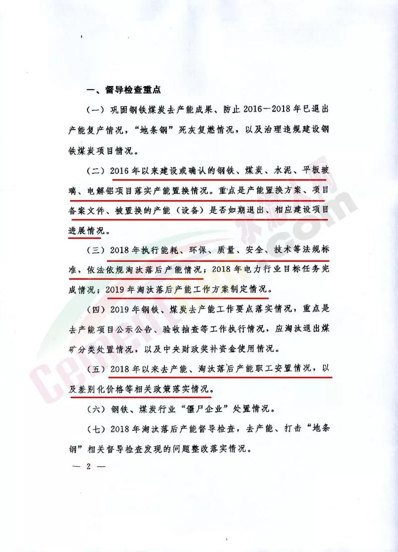 通知督導(dǎo)檢查重點包括2016年以來建設(shè)或確認的鋼鐵、煤炭、水泥、平板玻璃、電解鋁項目落實產(chǎn)能置換情況。重點是產(chǎn)能置換方案、項目備案文件、被置換的產(chǎn)能(設(shè)備)是否如期退出、相應(yīng)建設(shè)項目進展情況。 2018年執(zhí)行能耗、環(huán)保、質(zhì)量、安全、技術(shù)等法規(guī)標準,依法依規(guī)淘汰落后產(chǎn)能情況;2019年淘汰落后產(chǎn)能工作方案制定情況。 2018年以來去產(chǎn)能、淘汰落后產(chǎn)能職工安置情況,以及差別化價格等相關(guān)政策落實情況。建立健全去產(chǎn)能、淘汰落后產(chǎn)能舉報響應(yīng)機制情況,以及2018年以來舉報線索處置情況 。 督查檢查方式包括以查閱書面材料代替政府工作匯報會;根據(jù)檢查重點和問題線索,采取重點檢查、隨機抽查不打招呼檢查、暗訪等形式。對《國務(wù)院辦公室關(guān)于對2018年落實有關(guān)重大政策措施真抓實干成效明顯地方予以督查激勵的通報》中予以督查激勵的相關(guān)縣(市、區(qū)、旗),原則上實行“免檢查”。 督查檢查安排7月中旬至8月中旬各省級人民政府按照本通知相關(guān)要求開展自查。8月15日至9月15日,由工業(yè)和信息化部、發(fā)展改革委、能源局、生態(tài)環(huán)境部、應(yīng)急管理部、市場監(jiān)督總局、煤監(jiān)局司局級負責(zé)同志帶隊,相關(guān)部門和行業(yè)協(xié)會人員參加,組成10個聯(lián)合督導(dǎo)檢查組,開展實地督查檢查。具體時間由各督導(dǎo)檢查組對接確定。