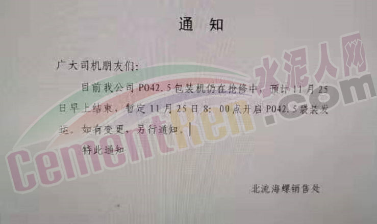 尊敬的各位客戶、司機朋友北流海螺PO袋裝生產(chǎn)線因設備故障需停機維修,計劃維修時間為2019年11月20日0點至2019年11月23日早上8點,設備檢修期間42.5袋裝暫停發(fā)貨。