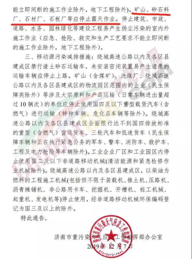 淄博市發(fā)布《重污染天氣橙色預(yù)警,啟動Ⅱ級應(yīng)急響應(yīng)的通知》,礦山、砂石料廠、石材廠、石板廠等停止露天作業(yè);施工工地停止土石方作業(yè)、建筑拆除、噴涂粉刷、護(hù)坡噴漿、混凝土攪拌及澆筑等;