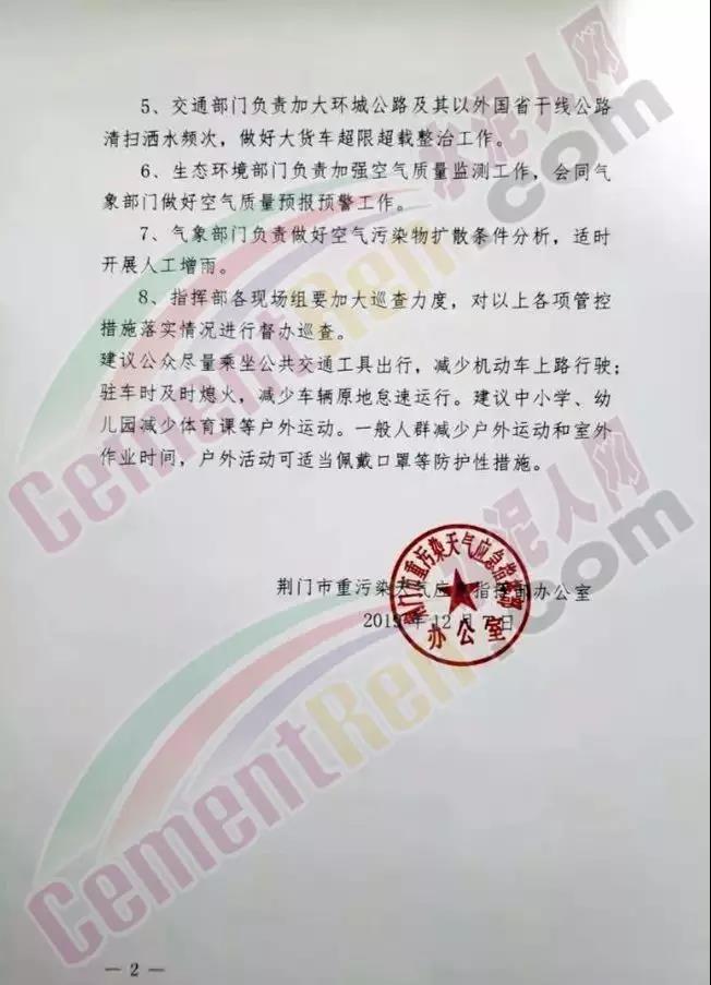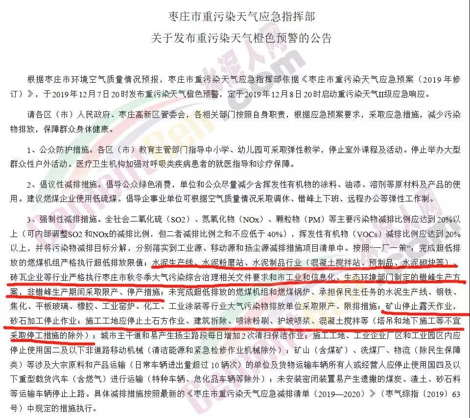 棗莊市重污染天氣應(yīng)急指揮部發(fā)布關(guān)于發(fā)布重污染天氣橙色預(yù)警的公告,稱水泥生產(chǎn)線、水泥粉磨站、水泥制品行業(yè)(混凝土攪拌站、預(yù)制品、水泥砌塊等)、磚瓦企業(yè)等行業(yè)嚴(yán)格執(zhí)行棗莊市秋冬季大氣污染綜合治理相關(guān)文件要求和市工業(yè)和信息化、生態(tài)環(huán)境部門制定的錯峰生產(chǎn)方案,非錯峰生產(chǎn)期間采取限產(chǎn)、停產(chǎn)措施;未完成超低排放的燃煤機(jī)組和燃煤鍋爐、承擔(dān)保民生任務(wù)的水泥生產(chǎn)線、鋼鐵、焦化、平板玻璃、橡膠、工業(yè)窯爐、化工、工業(yè)涂裝等行業(yè)大氣污染物排放單位采取限產(chǎn)、限排措施;礦山停止露天作業(yè),砂石加工停止作業(yè);施工工地應(yīng)停止土石方作業(yè)、建筑拆除、噴涂粉刷、護(hù)坡噴漿、混凝土攪拌等(塔吊和地下施工等不宜采取停工措施的除外);城市主干道和易產(chǎn)生揚(yáng)塵路段每日增加2次清掃保潔作業(yè);