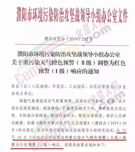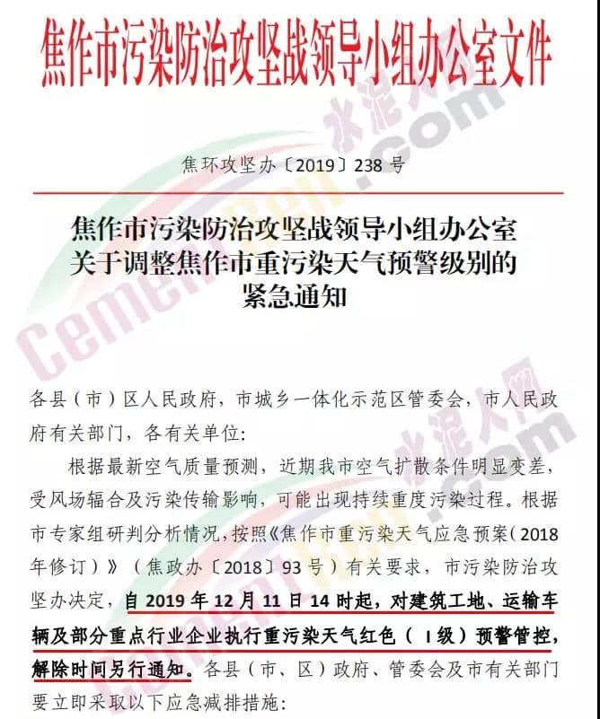 焦作市污染防治攻堅(jiān)戰(zhàn)領(lǐng)導(dǎo)小組辦公室通知自12月11日14時(shí)起對建筑工地、運(yùn)輸車輛及部分重點(diǎn)行業(yè)企業(yè)執(zhí)行重污染天氣紅色(I級)預(yù)警管控。通知要求執(zhí)行重污染天氣紅色( I 級)預(yù)警措施的水泥粉磨站企業(yè)為焦作堅(jiān)固水泥有限公司、焦作千業(yè)水泥有限 責(zé)任公司、焦作市中晶水泥有限責(zé)任公司、焦作市賽雪白水泥有 限公司、博愛金隅水泥有限公司、沁陽市金隅水泥有限公司、焦作市鵬遠(yuǎn)水泥有限公司、焦作市永石水泥廠、沁陽市太華建材有 限公司、焦作市丹陽水泥有限公司。同時(shí),礦山停止作業(yè)。