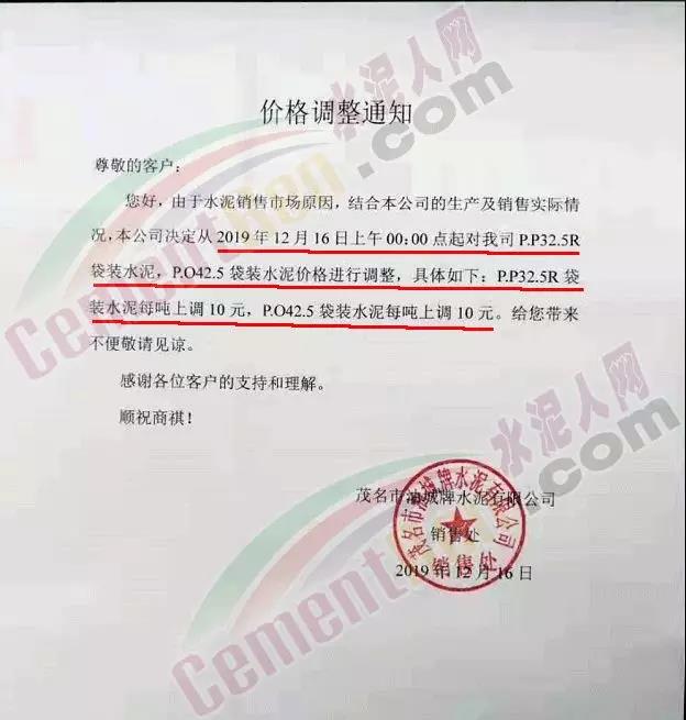 日前,河南省、廣東省及廣西壯族自治區(qū)部分區(qū)域企業(yè)通知上調(diào)水泥價(jià)格:華潤(rùn)水泥通知自2019年12月17日零時(shí)起惠州地區(qū)全品種袋裝、散裝水泥價(jià)格上調(diào)20元/噸 。廣西合浦南珠水泥廠通知自2019年12月17日起,水泥價(jià)格上調(diào)30元每噸。茂名市油城牌水泥通知自12月16日0時(shí)起,P.P32.5R袋裝水泥,PO42.5袋裝水泥價(jià)格上調(diào)10元/噸。原陽(yáng)縣同力水泥通知自12月16日中午12時(shí)起,PSA32.5R級(jí)、PO42.5級(jí)水泥在原執(zhí)行價(jià)格基礎(chǔ)上上調(diào)30元/噸。