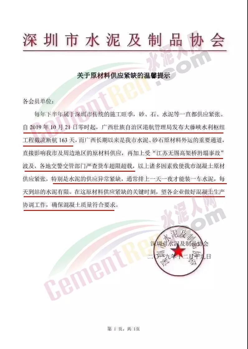 12月19日,深圳市水泥及制品協(xié)會(huì)緊急發(fā)文預(yù)警,《關(guān)于原材料供應(yīng)緊缺的提示》,自2019年10月21日零時(shí)起,廣西壯族自治區(qū)港航管理局發(fā)布大藤峽水利樞紐工程截留斷航163天,而廣西長(zhǎng)期以來(lái)是水泥、砂石原材料外運(yùn)的重要通道,直接影響廣西及周邊地區(qū)的原材料供應(yīng),再加上受“江蘇無(wú)錫高架橋坍塌事故”涉及,各地交警交管部門(mén)嚴(yán)查貨車超限超載,以上諸多因素致使廣西混凝土原材料供應(yīng)緊張,特別是水泥的供應(yīng)異常緊缺,通常排上一天一夜才能裝一車水泥,每天到站的水泥有限,在這原材料供應(yīng)緊缺的關(guān)鍵時(shí)刻,望各企業(yè)做好混凝土生產(chǎn)協(xié)調(diào)工作,確?;炷临|(zhì)量符合要求。